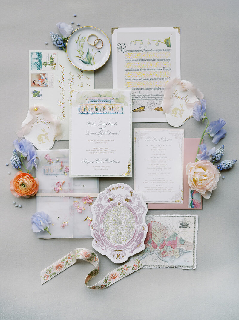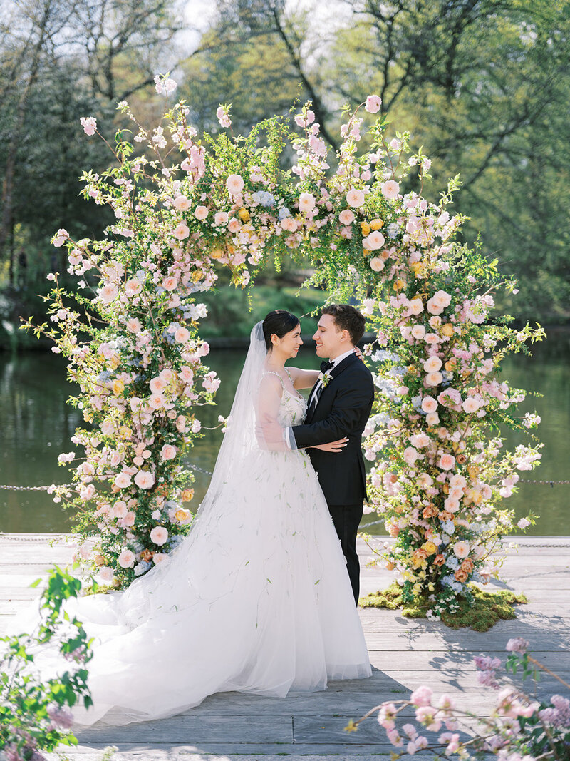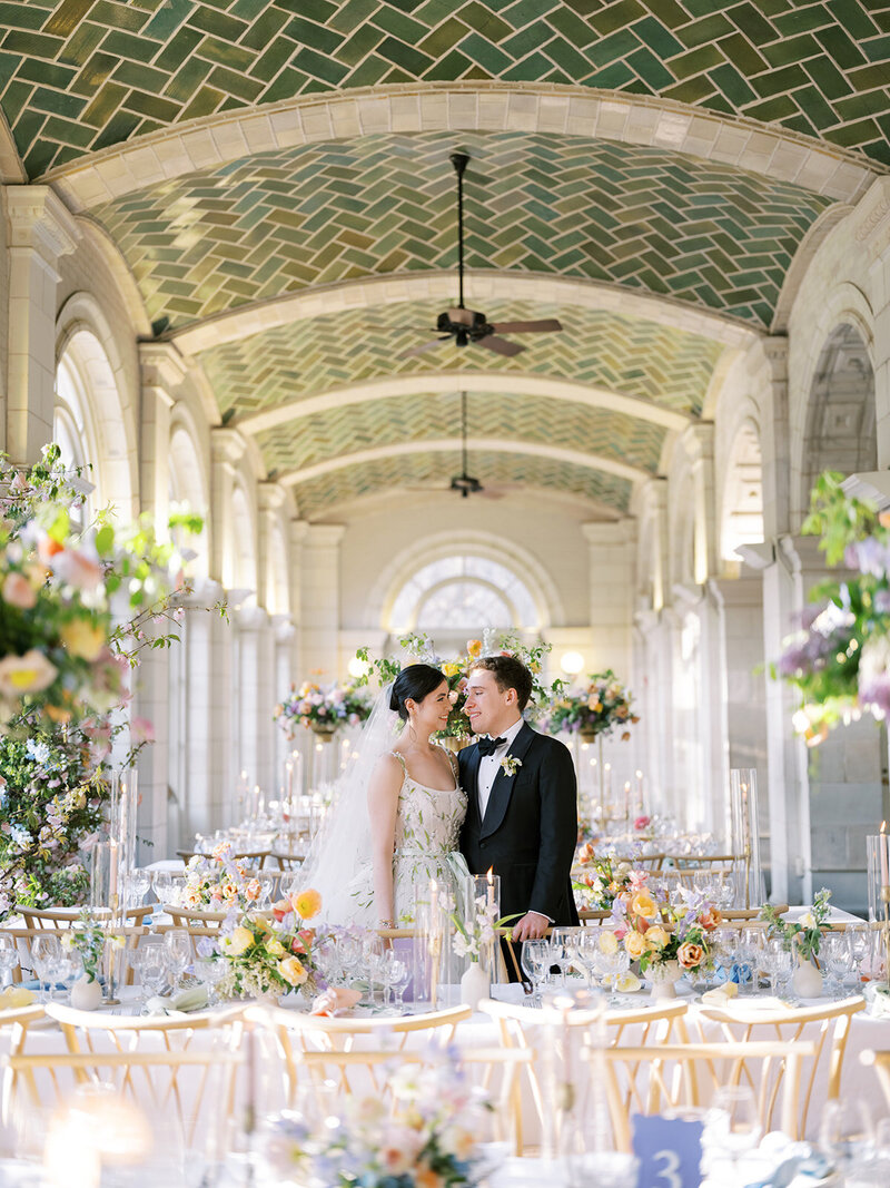 Robin stunned throughout the weekend, starting with an Oscar de la Renta mini for the rehearsal dinner and culminating in her breathtaking Monique Lhuillier lily of the valley gown on the wedding day. Sam got ready at his grandmother’s family home in New York City, a sentimental beginning to a day full of beauty and love. Friends and family traveled together by trolley to the iconic venue, where a celebration inspired by artwork, lush gardens, and the romantic charm of the French countryside awaited. Painterly pastels, delicate florals, and whimsical details brought the couple’s vision to life, making the entire day feel like stepping into a living painting.